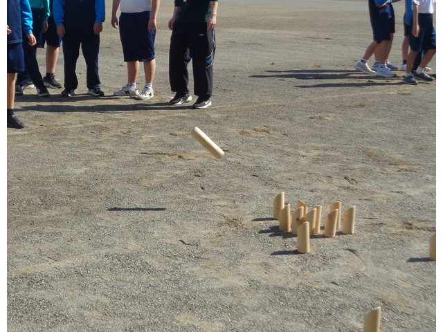 8組、9組がモルックを楽しんでいる様子を参観しました。モルックとは、フィンランド発祥で、木製の棒(モルック)を投げて数字付きのピンを倒し、ちょうど50点を先取したチームが勝つスポーツです。初めて経験する生徒もいるためルールを説明する必要があるのですが、驚いたことに、ルールを説明しているのが先輩の生徒だったということです。「この棒を持って下から投げます」「ピンが1本倒れたら、ピンに書かれた数字が点数です」「もし二本以上倒れたら、倒れたピンの本数が点数です」「ちょうど50点を目指します。50点を過ぎたら25点からやり直しです」などなど、生徒が一生懸命説明してくれていました。遊びながら、説明する力、仲間と協力する力、50にするためにどうしたらよいかという思考力など、様々な力が身についていくことを実感しました。歓声が上がる楽しい時間でした!